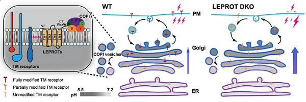 COPI介导的膜转运,在细胞中主要负责内质网蛋白回收和高尔基体蛋白滞留。研究发现,LEPROTs主要定位于顺式与中间高尔基体区域,其缺失会导致高尔基体形态异常。同时,LEPROTs可与COPI衣被蛋白及多类跨膜区较长的整合膜蛋白结合,在酸性环境下将跨膜受体捕捉,并由COPI系统将其短暂“滞留”于高尔基体,使其获得充分的糖基化、脂酰化等关键修饰。在LEPROTs缺失的细胞里,跨膜受体被提前释放至下游通路,使EGFR、TFRC等多种信号受体发生加工缺陷和活性异常。
