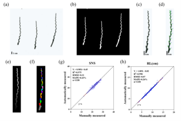 RachisSeg实现了节间长度、宽度、穗轴长度、穗粒数和小穗分布等多类性状的高效测定。该方法在大规模样本中的表现优异,自动测量结果与人工测量高度一致,显示出极高的精度与稳定性。