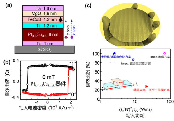 (a)垂直各向异性FeCoB器件结构;(b)零磁场下实现“0”和“1”状态的100%全电翻转;(c)晶圆级均一自旋轨道矩器件阵列及其功耗和翻转比例。