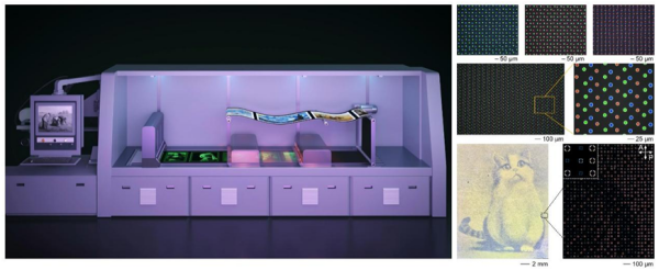 针对以上技术瓶颈,研究团队首先从结构着手,创制出一种由周期性纳米晶格构成的微米尺度半球形结构(图1),该结构通过协同光子晶格与光学界面的耦合作用,对多尺度下的光学传输行为进行精准调控,使得单元结构呈现丰富的色彩变幻,犹如万花筒般一转千色。在规模化制备方面,团队研发了高通量按需打印与卷对卷连续制造工艺,就像报纸印刷一样,将柔性基材从一个滚筒连续输送到另一个滚筒,连续完成纳米级精度打印成型,这一技术可将低成本聚合物纳米材料快速制备为单像素性能定制的光学超材料,实现跨越多个尺度的精准制造。